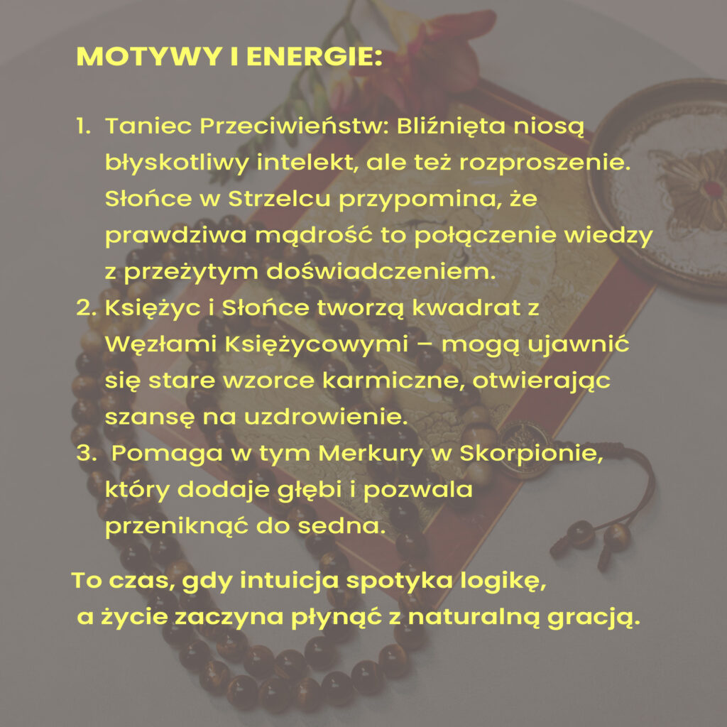 Pełnia w Bliźniętach zamyka cykl rozpoczęty podczas nowiu w maju – to czas zbioru doświadczeń, integracji wiedzy i świadomego wyboru, co zabieramy ze sobą w nowy rok.