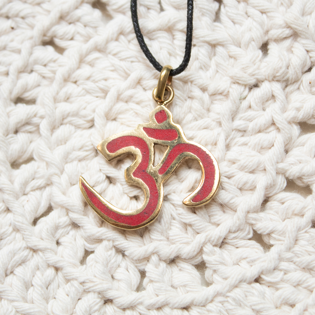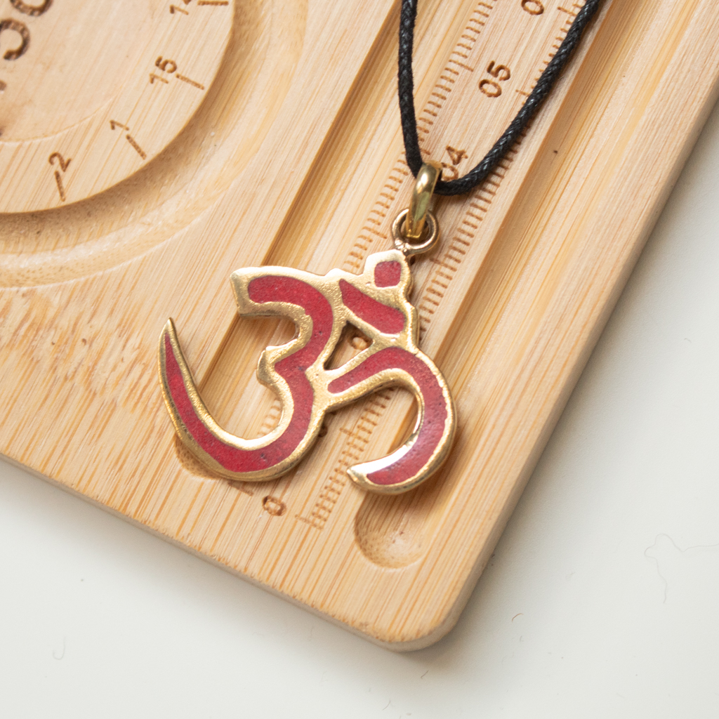 Amulet Sylaba Om, czerwony koral i metal. Wisior w stylu hinduskim.