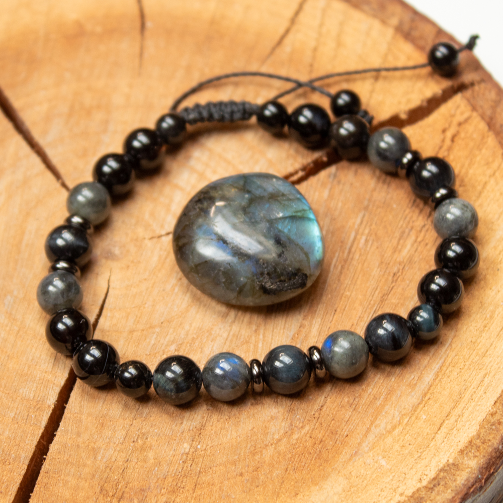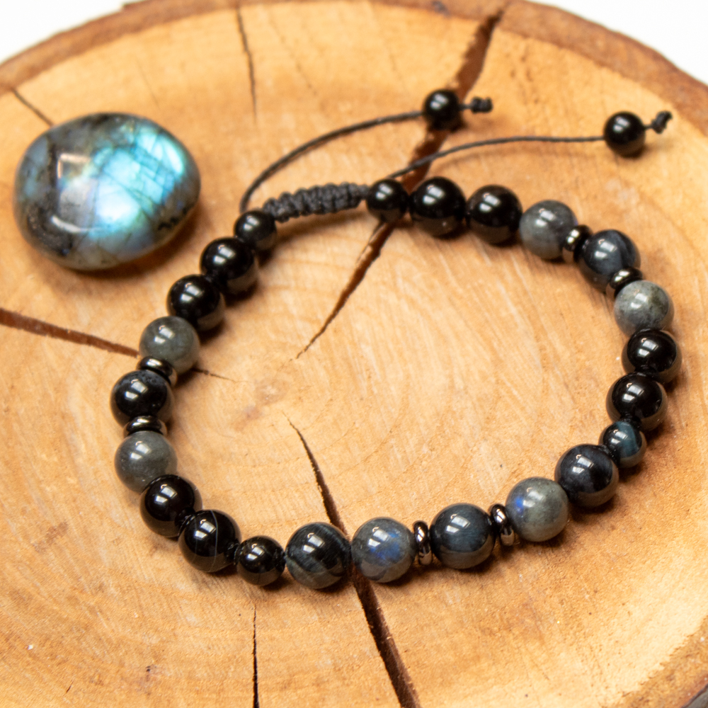 Bransoletka harmonizująca energie dla znaku zodiaku Bliźnięta z kamieniami naturalnymi: Sokole Oko, Czarny Obsydian i Labradoryt.