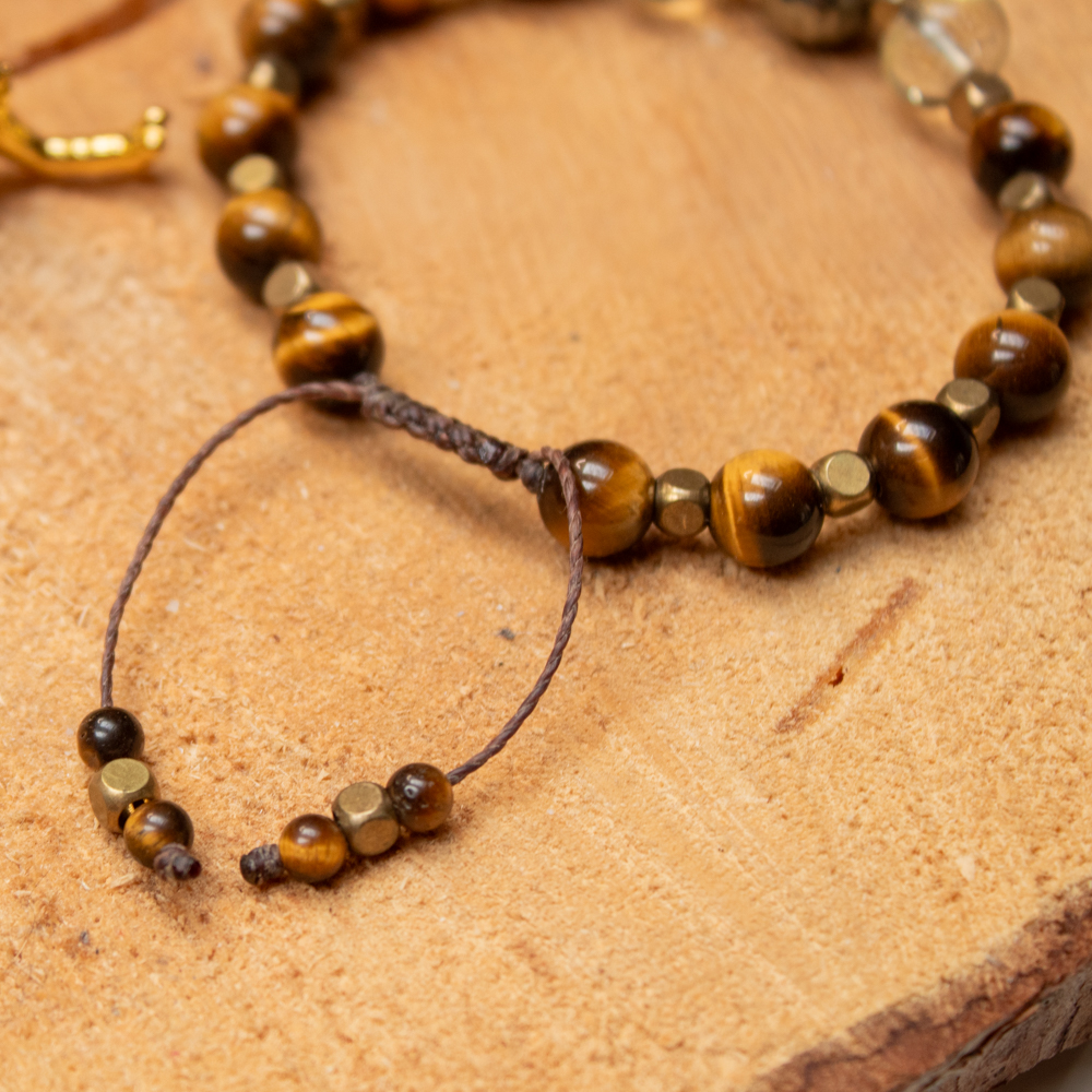 • Materiały: cytryn, tygrysie oko, piryt, mosiądz, sznurek brazylijski (poliestrowy, woskowany)