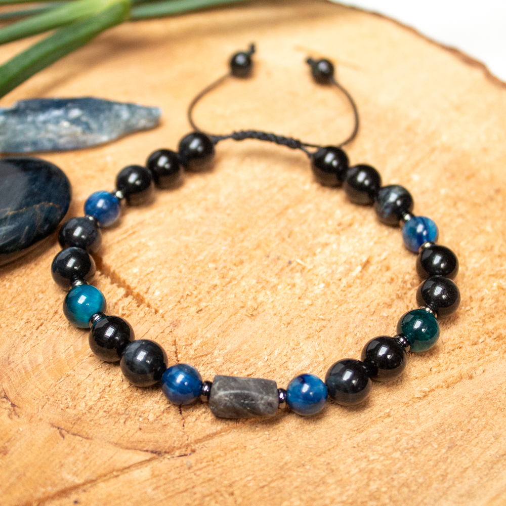 Bransoletka z kamieniami naturalnymi 8 mm: Kianit (Kyanit), Szafir i Sokole Oko.
