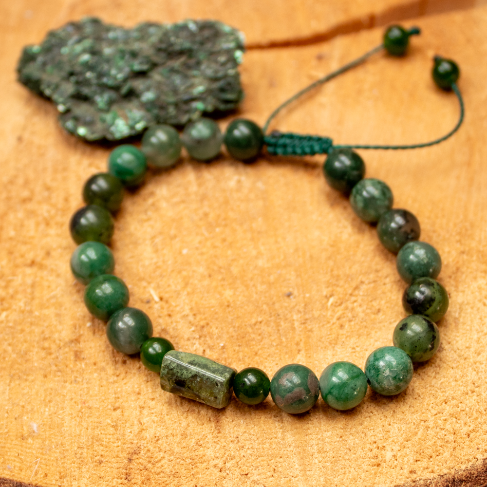 Bransoletka z zielonymi kamieniami naturalnymi 8 mm i wałeczkiem: Prehnit, Fuchsyt i Zielony Jadeit Kanadyjski.