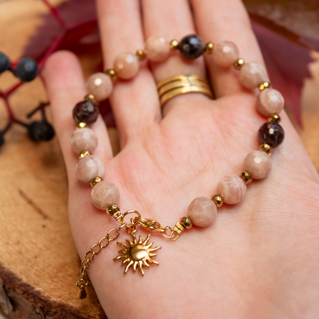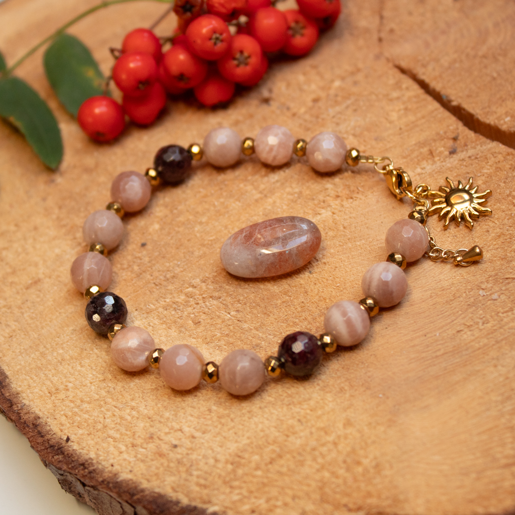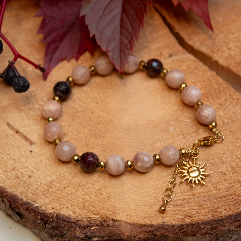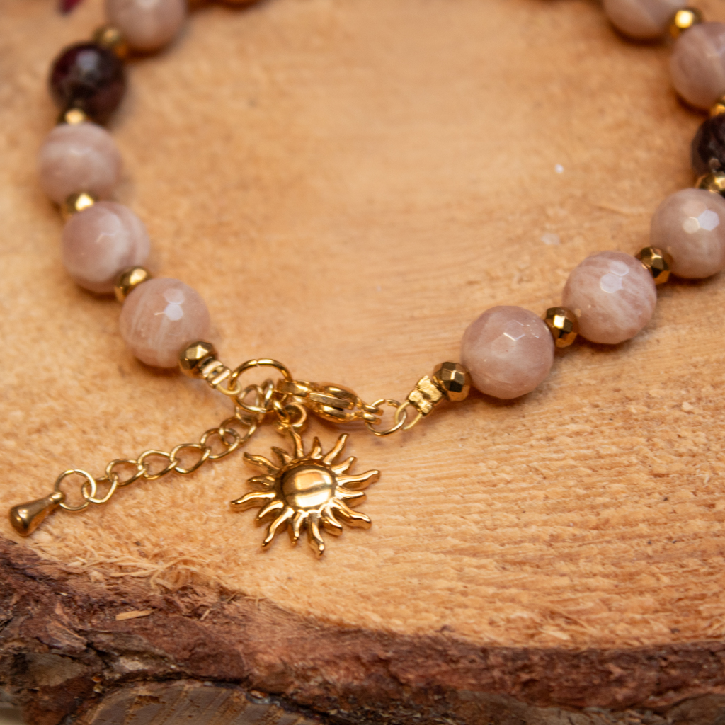 Bransoletka z Kamieniem Słonecznym, Granatem i Hematytem z zawieszką Słońce. Stal