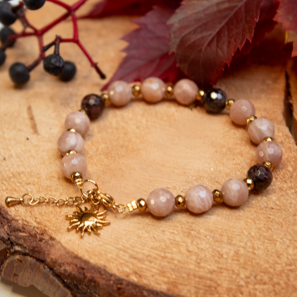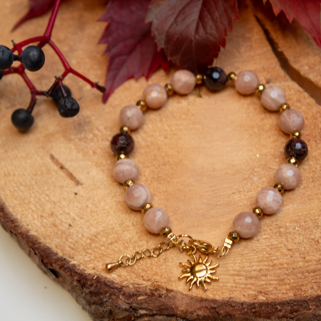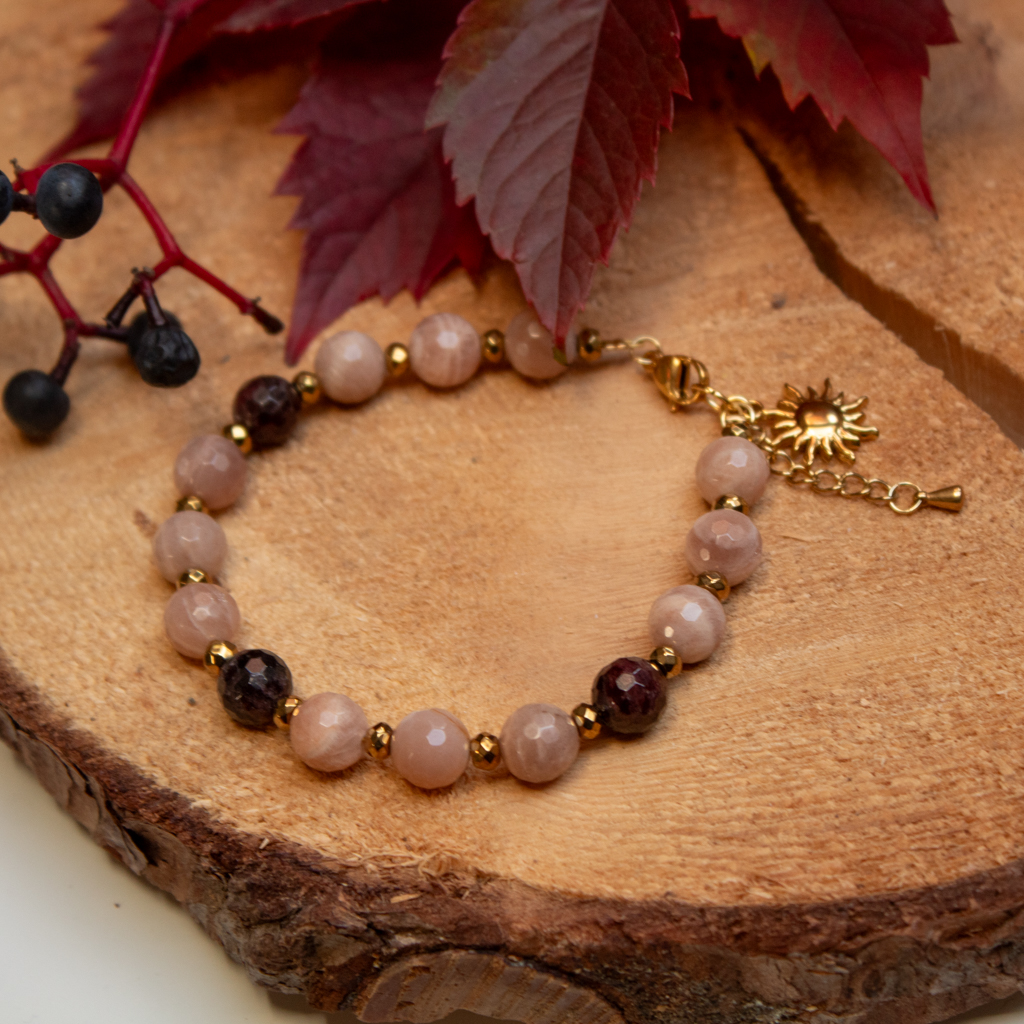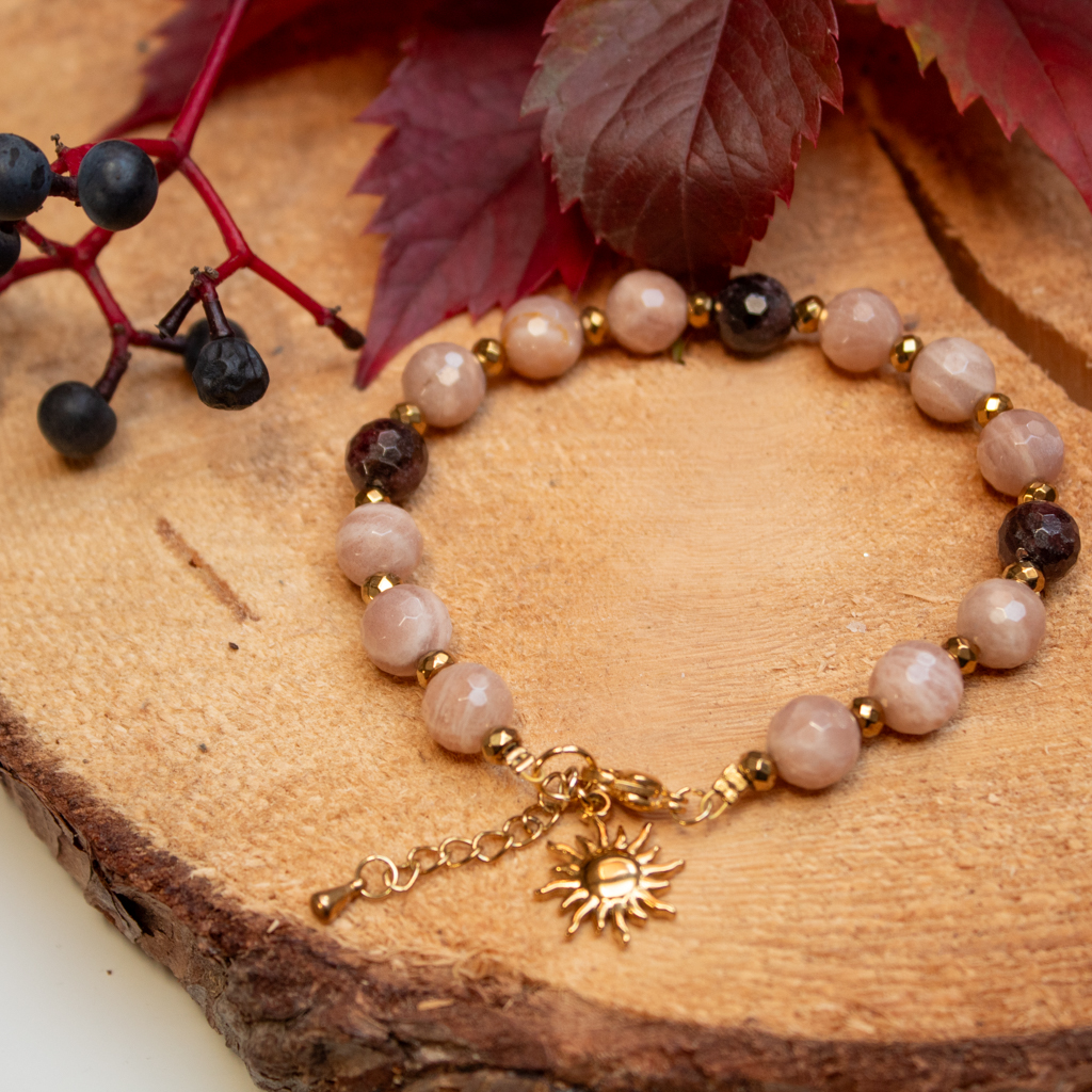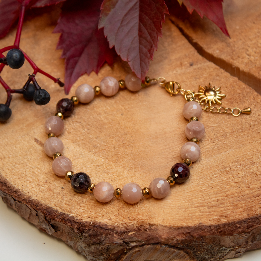 Bransoletka z Kamieniem Słonecznym, Granatem i Hematytem z zawieszką Słońce. Stal