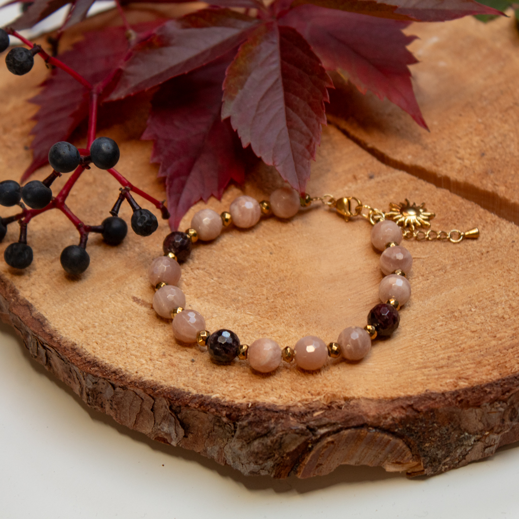 Piękna bransoletka o energii słonecznej elegancji wykonana z fasetowanych kamieni naturalnych: Kamienia Słonecznego, Hematytu i Granatu.