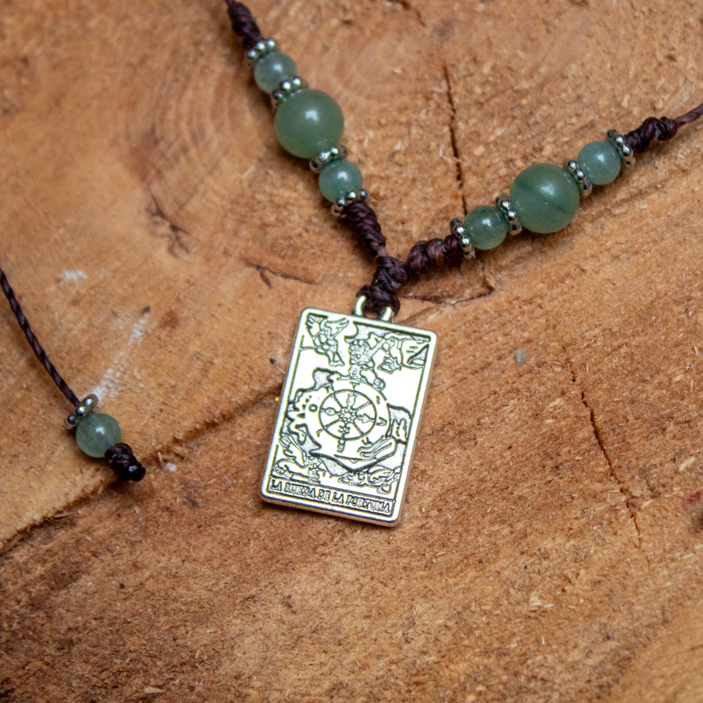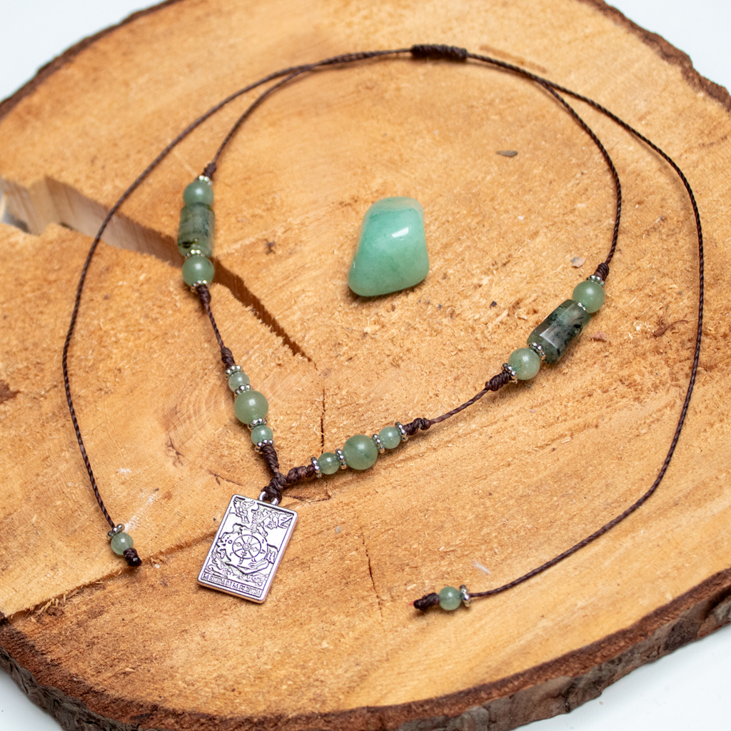 Naszyjnik CHOKER na sznurku z Awenturynem Zielonym i Prehnitem, ozdobiony Kartą Tarota Wheel of Fortune (Koło Fortuny) – talizman cyklu życia i synchroniczności.