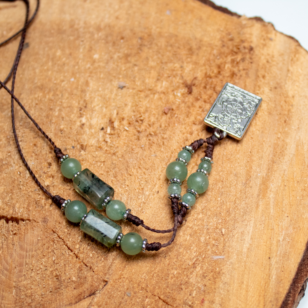 - Materiały: Awenturyn Zielony, Prehnit, zawieszka (posrebrzany mosiądz), sznurek jubilerski (poliestrowy woskowany), elementy metalowe (stop cynku)