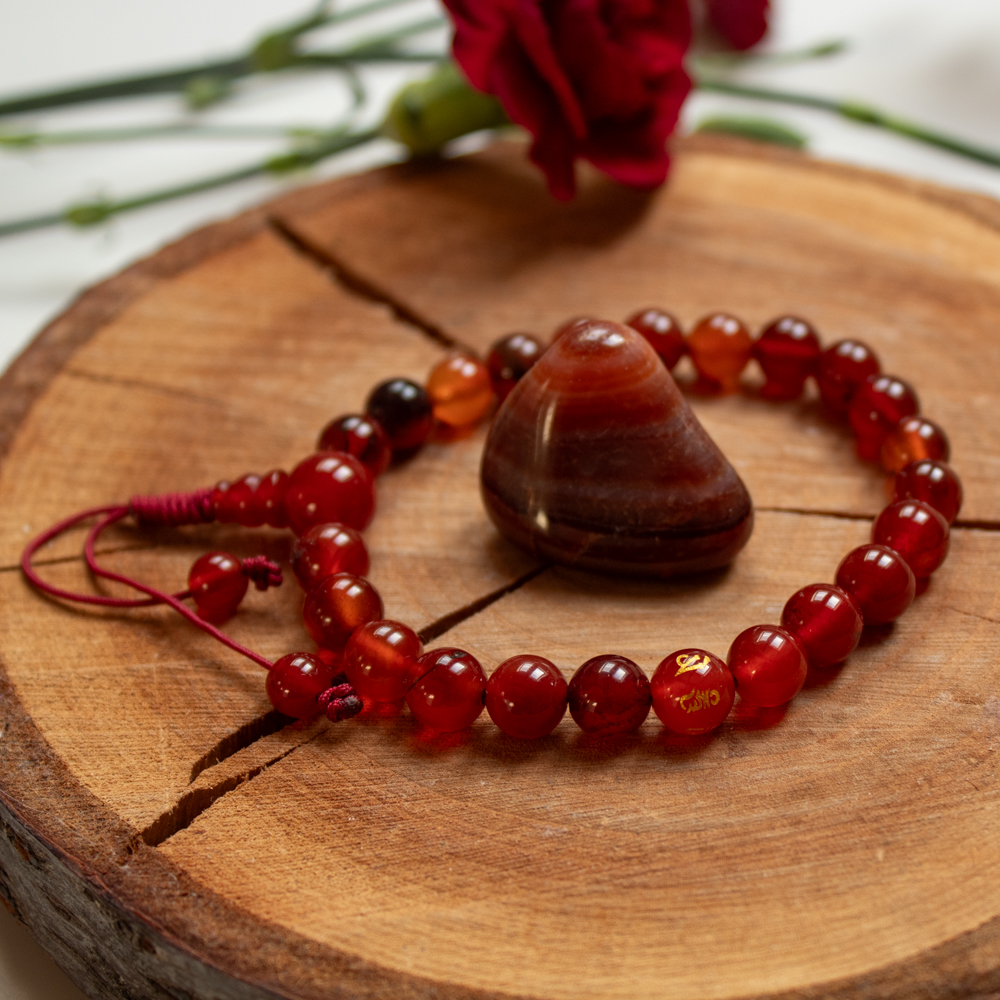 Mala buddyjska na rękę: Czerwony Karneol z Mantrą Om Mani Padme Hum