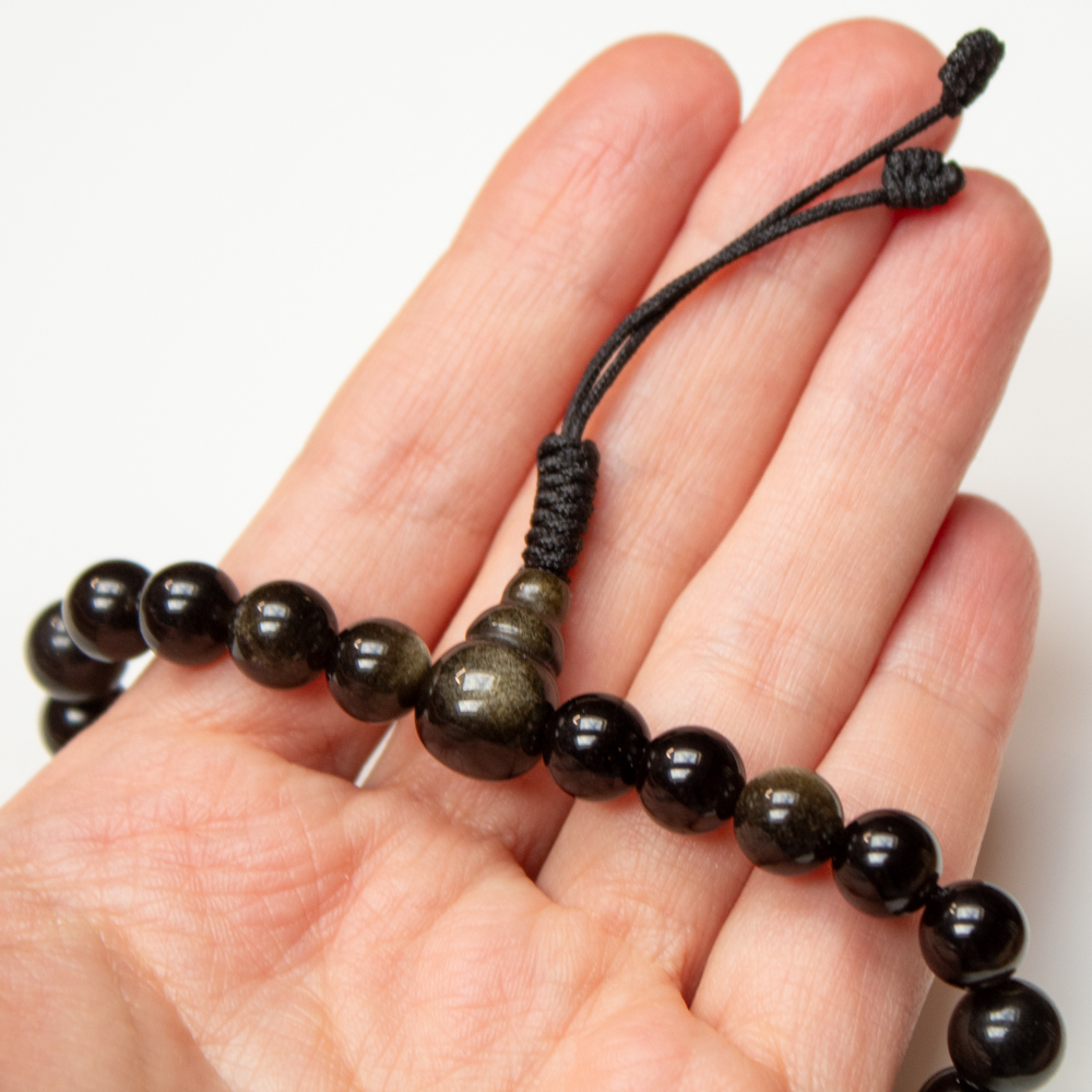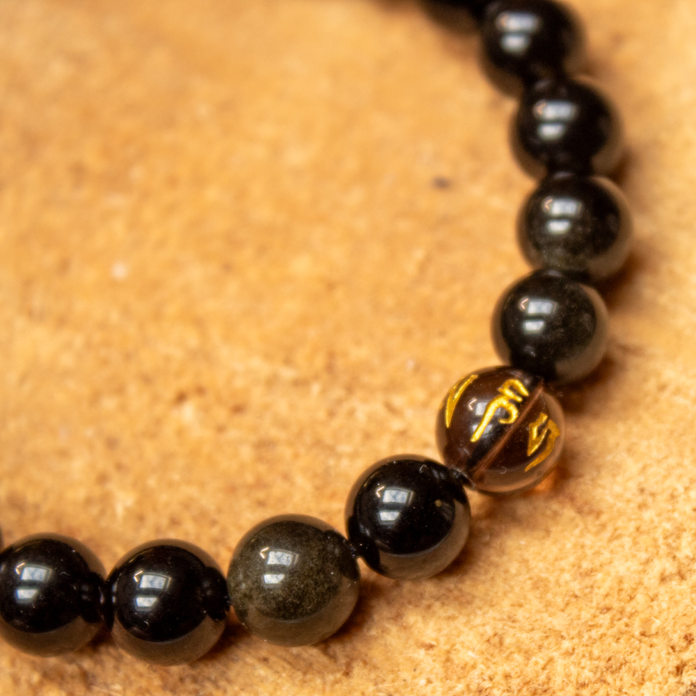 Mala buddyjska na rękę Złoty Obsydian i Kwarc Dymny z Mantrą