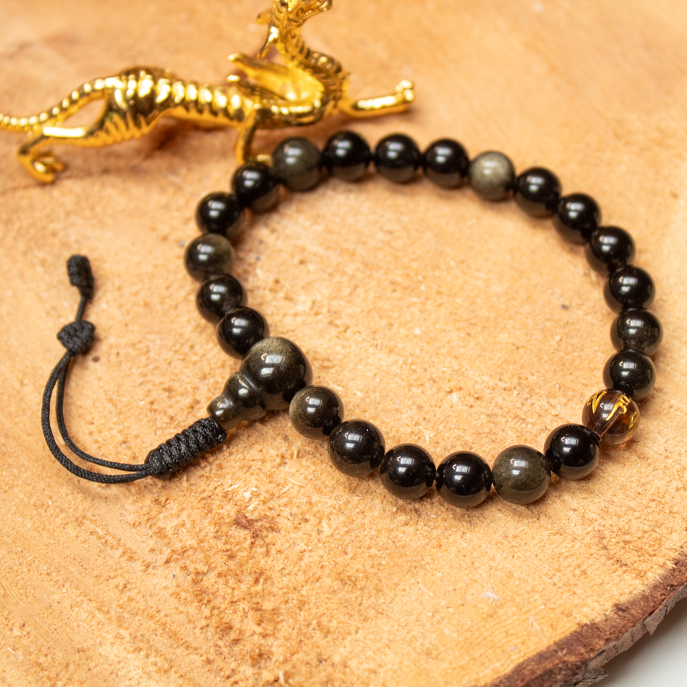 Bransoletka z kamieniami naturalnymi: złoty obsydian i kwarc dymny 8 mm.